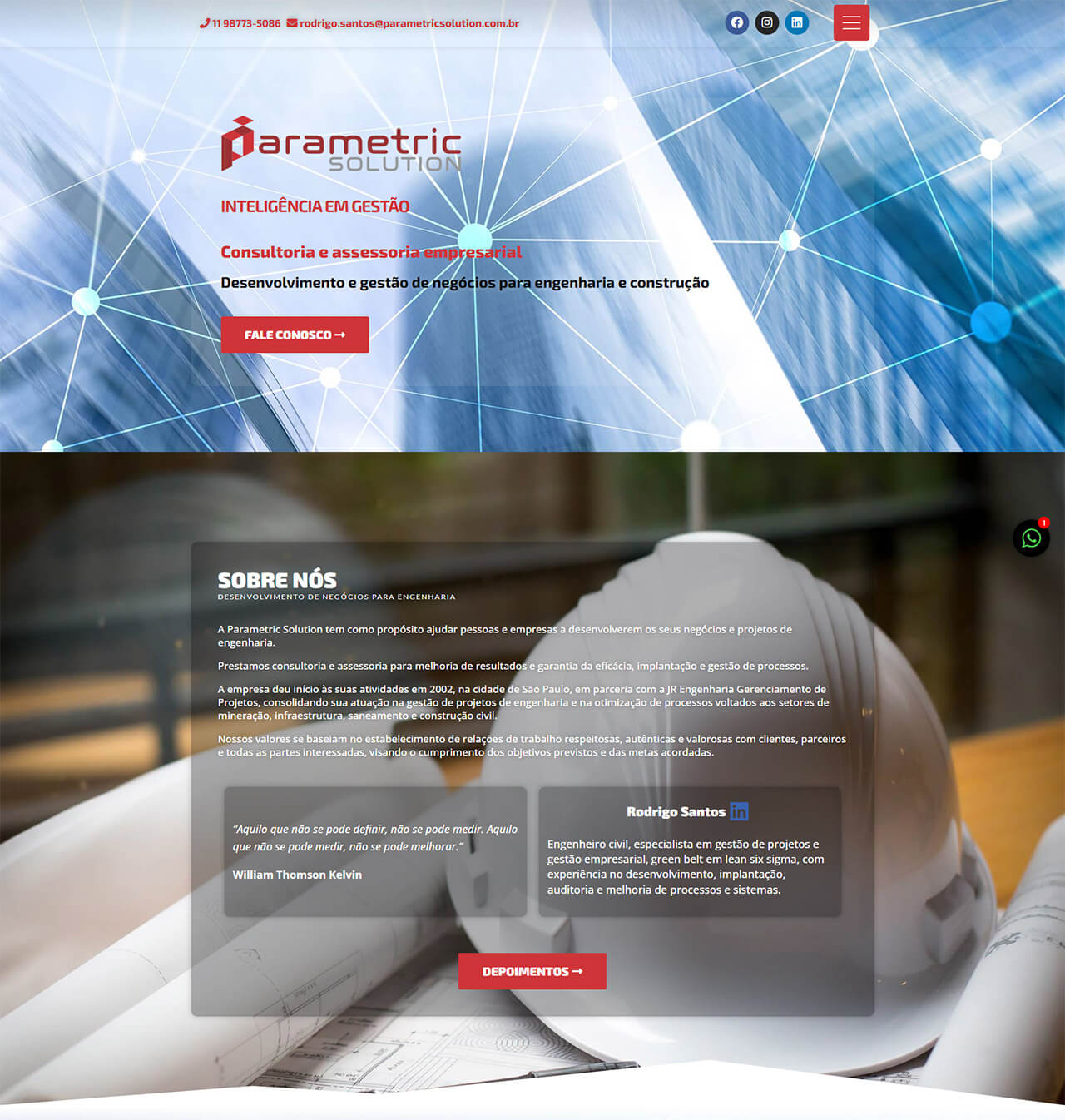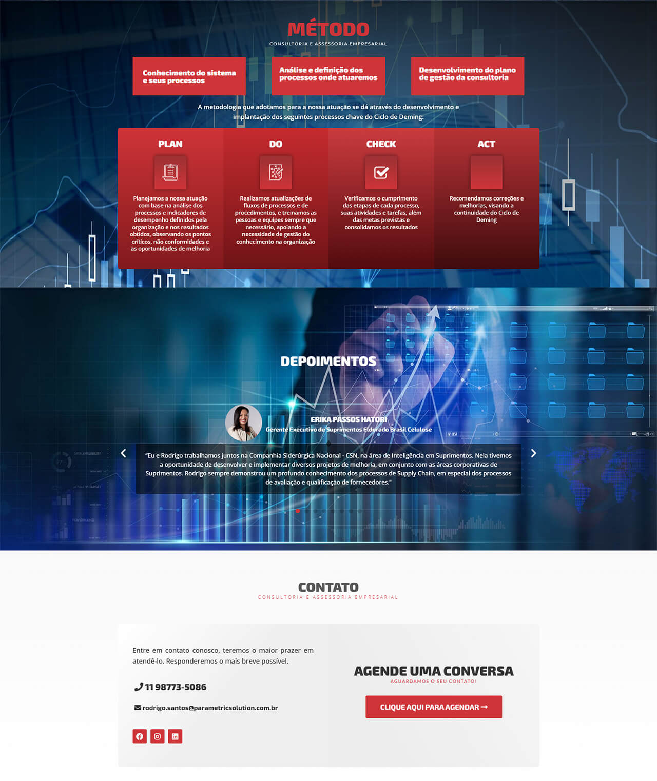 O objetivo de obter mais leads e conversões é alcançado por meio de diversos elementos estratégicos. A página apresenta um “call-to-action” (chamada para a ação) claro e repetitivo, como “Solicite uma Análise” ou “Fale com um Especialista”. Esses botões direcionam o usuário para um formulário de contato simples ou para o WhatsApp da empresa, removendo qualquer barreira para o primeiro contato. Além disso, foram incluídos depoimentos de clientes satisfeitos para construir prova social e aumentar a confiança do potencial cliente. A criação de landing page também é otimizada para SEO, o que garante que a Parametric Solution apareça nos resultados de busca para quem procura por consultoria empresarial.