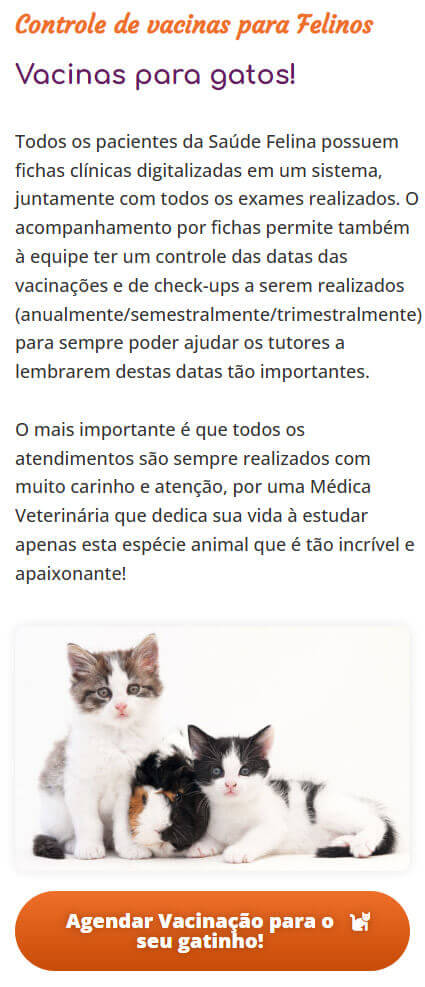 A justificação para a necessidade da criação de landing page, em detrimento de um site completo, está na sua eficácia para a conversão. Em vez de dispersar o tráfego de campanhas de marketing em um site com várias páginas, a landing page direciona o visitante para um funil de vendas claro. O usuário é apresentado de forma direta e concisa aos serviços e diferenciais da Saúde Felina e é incentivado, de forma clara, a realizar uma ação. Foram estrategicamente posicionados botões de “call-to-action”, como “Agende a Consulta” ou “Fale com Nossa Equipe”, que direcionam o usuário para um formulário de contato ou para o WhatsApp da clínica.