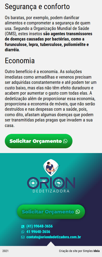 O objetivo principal da criação de landing page para a Orion Dedetizadora é a captação de leads qualificados e a conversão desses leads em clientes. Para alcançar isso, a página foi meticulosamente construída pela Simples Ideia. O design foi pensado para ser profissional e limpo, transmitindo a seriedade e a expertise da equipe. O texto é persuasivo e focado em resolver os problemas do cliente. Ele não apenas lista os serviços de dedetização de ratos e baratas, mas também aborda os perigos que essas pragas representam, educando o cliente e reforçando a urgência em contratar um serviço profissional.