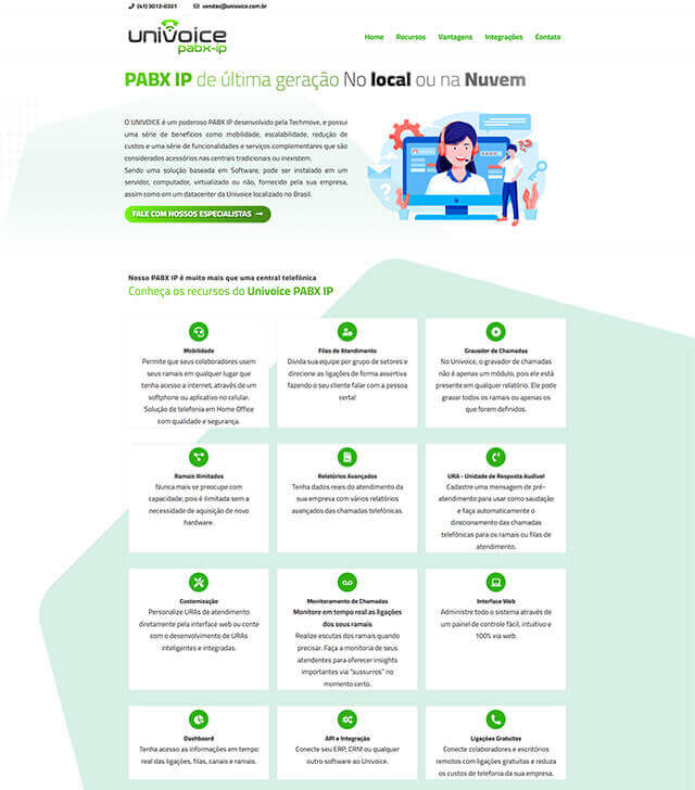 O objetivo principal deste projeto era claro: obter mais leads qualificados e converter esses visitantes em clientes. Para alcançar isso, a criação de landing page foi construída com princípios de design e copywriting que se aplicam especificamente ao mercado de tecnologia. O layout foi projetado pela Simples Ideia para ser moderno e profissional, com uma estética que remete à inovação e à eficiência. O texto foi escrito para ser persuasivo e focado em benefícios, abordando as “dores” do cliente e apresentando os produtos e serviços da Univoice como a solução ideal.