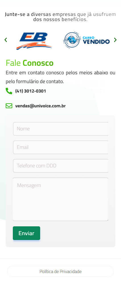 A justificação para a necessidade de uma landing page, em detrimento de um site completo, está na sua eficácia para a conversão. Em vez de dispersar o tráfego de campanhas de marketing em um site com várias páginas, a landing page direciona o visitante para um funil de vendas claro e conciso. O usuário é apresentado aos produtos e serviços da Univoice de forma direta e concisa e é incentivado a realizar uma ação. Foram estrategicamente posicionados botões de “call-to-action” (chamada para a ação), como “Solicite uma Demonstração” ou “Fale com um Consultor”, que direcionam o usuário para um formulário de contato simples ou para o WhatsApp da empresa, removendo qualquer barreira para o primeiro contato.