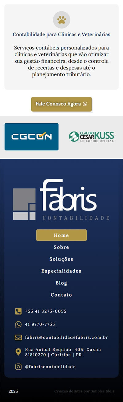 As qualidades dos sites feitos pela Simples Ideia – Criação de Sites em Curitiba – se manifestam plenamente no projeto da Fabris Contabilidade. A nossa agência não apenas constrói sites bonitos, mas desenvolve plataformas estratégicas que geram resultados. O site da Fabris Contabilidade é um exemplo de como a expertise técnica em desenvolvimento web pode ser aplicada para potencializar a atuação de um escritório contábil. Ele fortalece a marca Fabris Contabilidade, amplia seu alcance, atrai clientes qualificados e solidifica sua posição como um dos mais respeitados nomes em contabilidade em Curitiba. Investir na Criação de Sites para Contabilidade com a Simples Ideia é garantir que a experiência e o know-how de sua empresa sejam reconhecidos e valorizados no ambiente digital, impulsionando um sucesso definitivo.