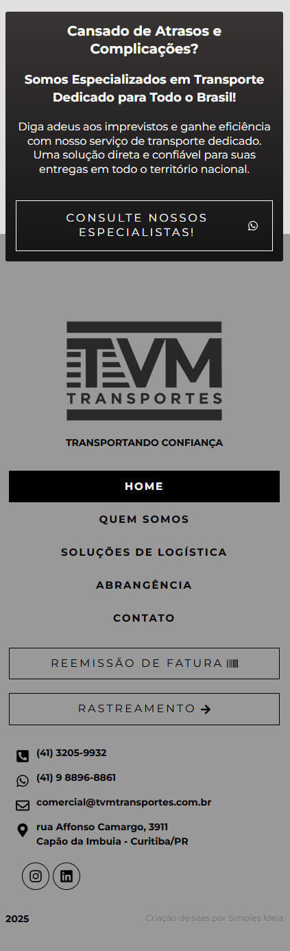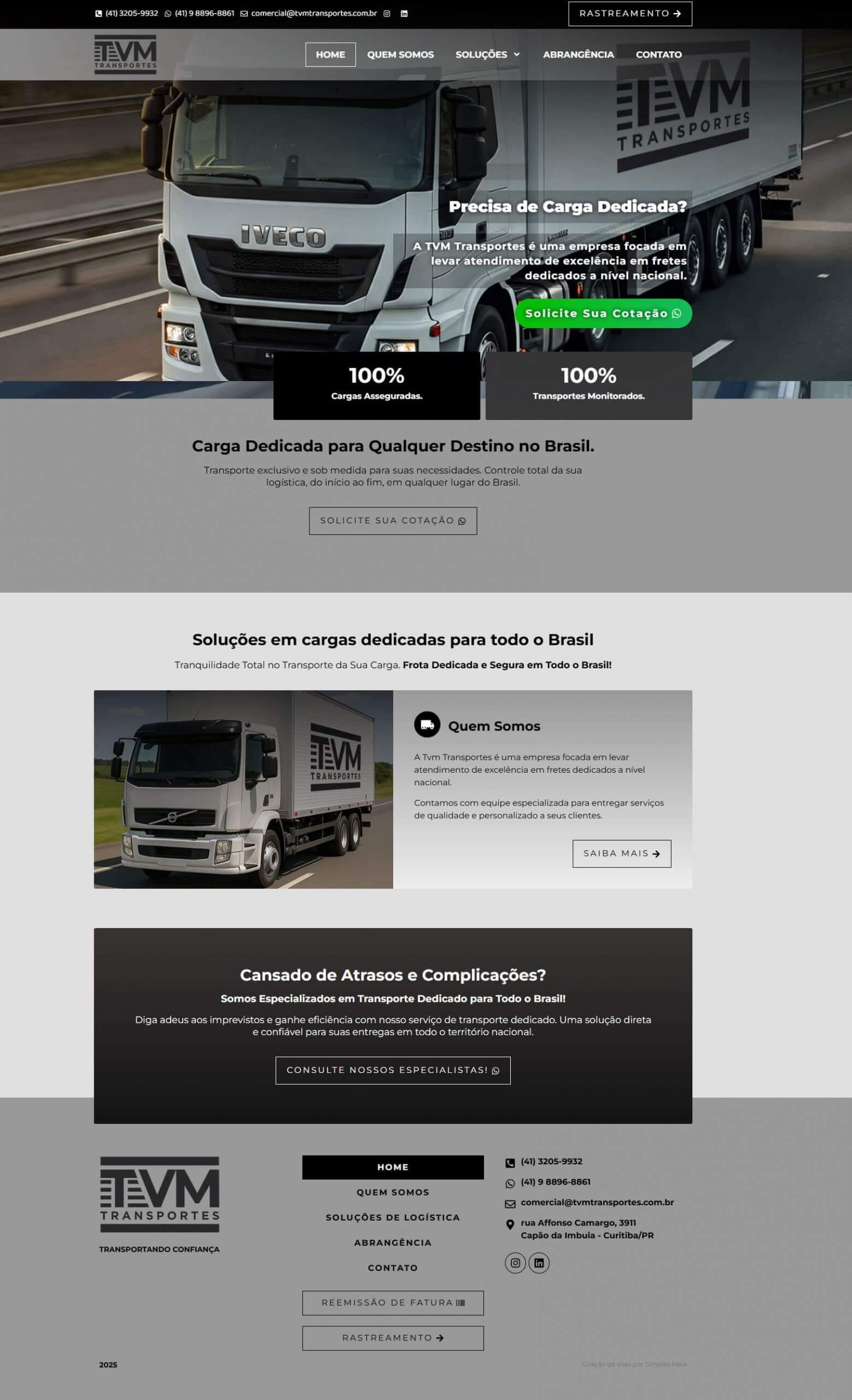 Sua transportadora merece uma presença digital que reflete sua excelência. A Simples Ideia, agência de design e internet, criou o site ideal para a TVM Transportes, especialista em fretes dedicados a nível nacional. Com um design profissional, intuitivo e otimizado para Google e Bing, sua página será a porta de entrada para novos leads, fortalecendo sua marca e impulsionando seu crescimento no mercado de logística.