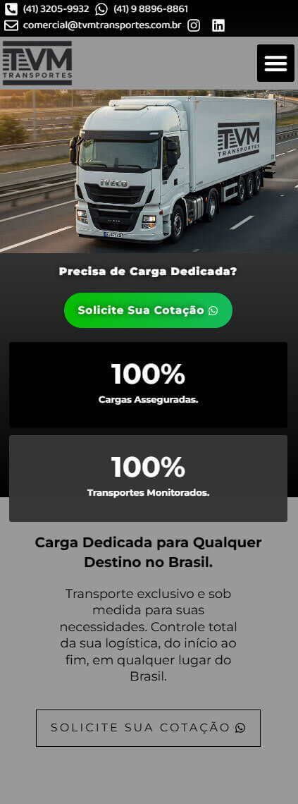 A necessidade da criação de site para a TVM Transportes se justifica pela mudança no comportamento do cliente moderno. Sejam empresas ou indústrias buscando soluções de transporte, a pesquisa por um parceiro de logística começa, majoritariamente, na internet. O cliente busca por informações sobre a empresa, sua expertise em fretes dedicados, sua área de atuação (que, no caso da TVM Transportes, é a nível nacional) e, o mais importante, um meio fácil e confiável para solicitar um orçamento ou tirar dúvidas. Um website bem-estruturado é a ferramenta perfeita para atender a todas essas necessidades de forma rápida e profissional.