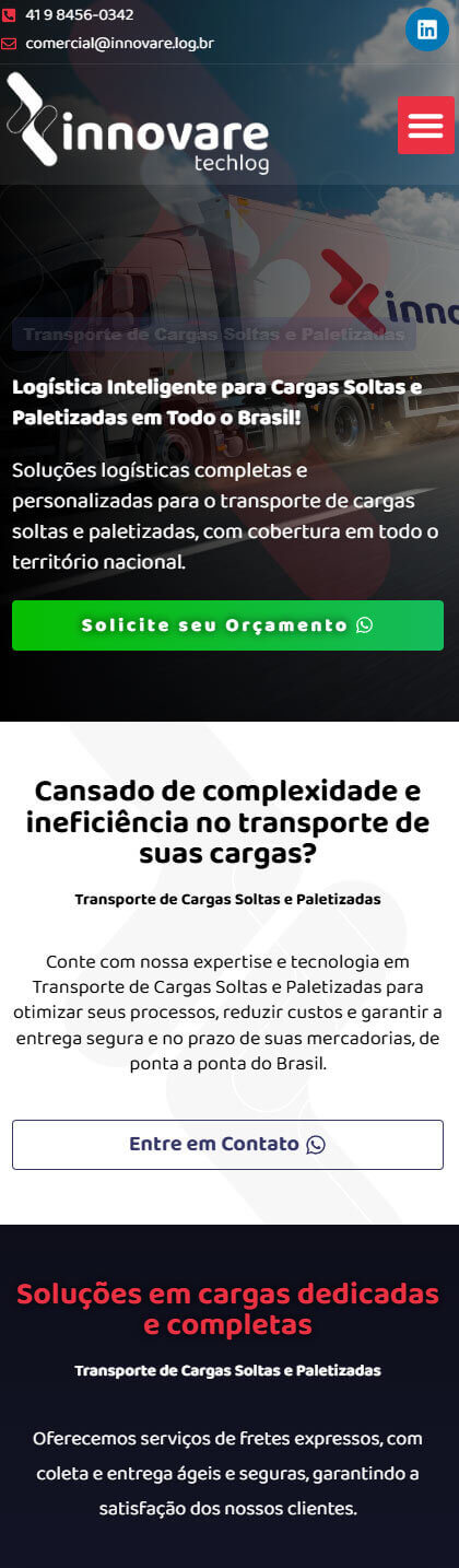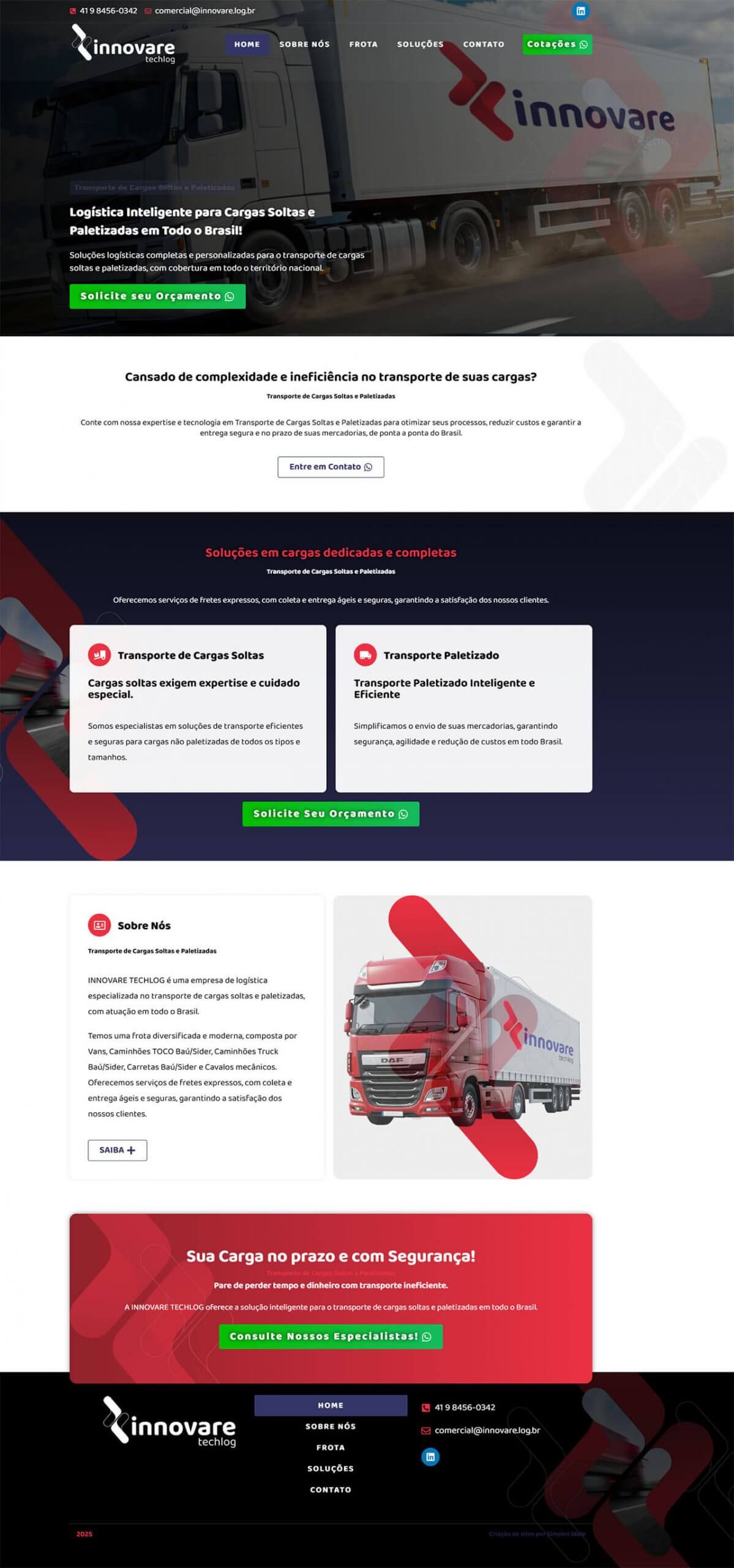 A necessidade da criação de site para a INNOVARE TECHLOG se justifica pela mudança no comportamento do cliente moderno. Sejam empresas ou indústrias buscando soluções de transporte, a pesquisa por um parceiro de logística começa, majoritariamente, na internet. O cliente busca por informações sobre a empresa, sua expertise no transporte de cargas soltas e paletizadas, sua área de atuação (que, no caso da INNOVARE TECHLOG, é o Brasil inteiro) e, o mais importante, um meio fácil e confiável para solicitar um orçamento ou tirar dúvidas. A criação de site bem-estruturado é a ferramenta perfeita para atender a todas essas necessidades de forma rápida e profissional.