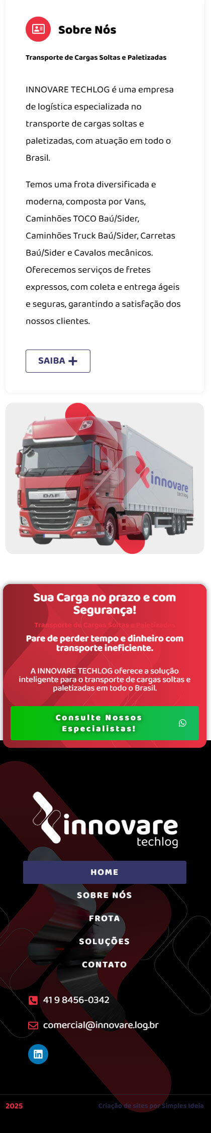 Sua transportadora merece uma presença digital que reflete sua excelência. A Simples Ideia, agência de design e internet, criou o site institucional ideal para a INNOVARE TECHLOG, especialista em transporte de cargas soltas e paletizadas em todo o Brasil. Com um design profissional e intuitivo, otimizado para Google e Bing, sua página será a porta de entrada para novos leads, fortalecendo sua marca e impulsionando seu crescimento no mercado de logística.