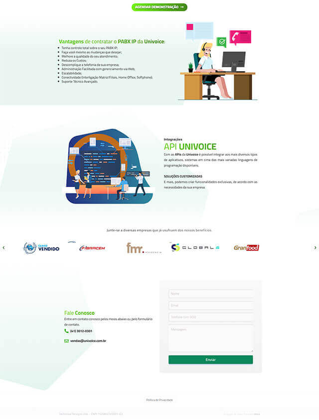 A justificação para a necessidade de uma landing page, em detrimento de um site completo, está na sua eficácia para a conversão. Em vez de dispersar o tráfego de campanhas de marketing em um site com várias páginas, a landing page direciona o visitante para um funil de vendas claro e conciso. O usuário é apresentado aos produtos e serviços da Univoice de forma direta e concisa e é incentivado a realizar uma ação. Foram estrategicamente posicionados botões de “call-to-action” (chamada para a ação), como “Solicite uma Demonstração” ou “Fale com um Consultor”, que direcionam o usuário para um formulário de contato simples ou para o WhatsApp da empresa, removendo qualquer barreira para o primeiro contato.