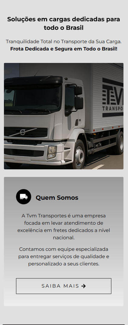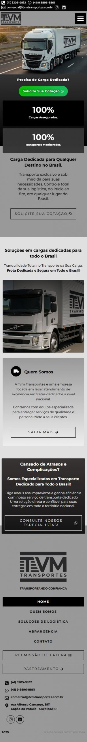 Sua transportadora merece uma presença digital que reflete sua excelência. A Simples Ideia, agência de design e internet, criou o site ideal para a TVM Transportes, especialista em fretes dedicados a nível nacional. Com um design profissional, intuitivo e otimizado para Google e Bing, sua página será a porta de entrada para novos leads, fortalecendo sua marca e impulsionando seu crescimento no mercado de logística.
