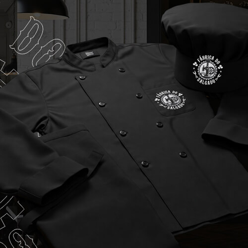 Para alcançar esse objetivo, foi desenvolvida uma estratégia de branding completa, centrada na criação de um logotipo robusto e impactante. O design circular, com elementos que remetem a engrenagens e a uma máquina de produção, evoca o conceito de “fábrica”, enquanto os talheres e os grãos de café (um acompanhamento clássico para salgados) inserem a marca no universo gastronômico. A tipografia bold e a paleta de cores escuras conferem um ar de sofisticação e solidez, resultando em uma identidade visual moderna com um toque vintage.