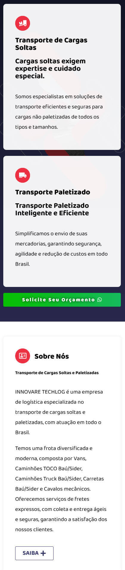 O objetivo principal da criação de site para a INNOVARE TECHLOG era claro: captar mais leads qualificados e converter esses visitantes em clientes de longo prazo. Para alcançar isso, a Simples Ideia desenvolveu um website que vai muito além de uma simples página de apresentação. Ele foi projetado como um funil de conversão, guiando o usuário de forma lógica e persuasiva. O design é clean, moderno e intuitivo, utilizando elementos visuais que remetem à agilidade, segurança e tecnologia, pilares do serviço da INNOVARE TECHLOG. O texto foi escrito para ser direto e persuasivo, destacando a especialização em cargas soltas e paletizadas, a abrangência nacional da atuação da empresa e os diferenciais que a tornam a melhor escolha para o transporte de cargas.